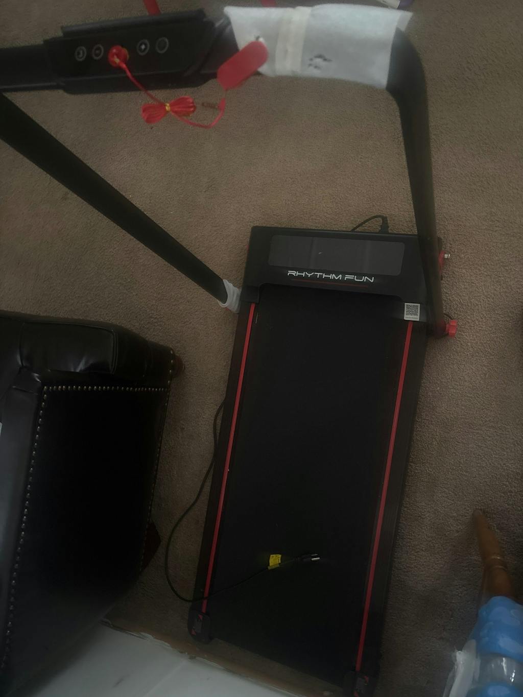 The hand bar is a bit short for me, but it does fit fit nicely when folded down out of the way. The machine is a very nice size, not too big, but not too small. It is quiet, and the decorative red stripes on either side of the walking belt are a nice peripheral visual so you know you are centered. This is important to me as a 60 yr old who suffers from macular degeneration, fibromyalgia, and degenerative/bulging discs. While I cannot expect my eyesight to improve I do expect my balance to improve with use,