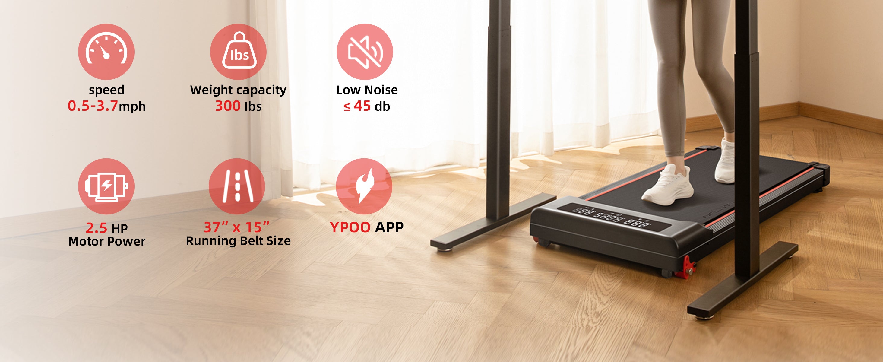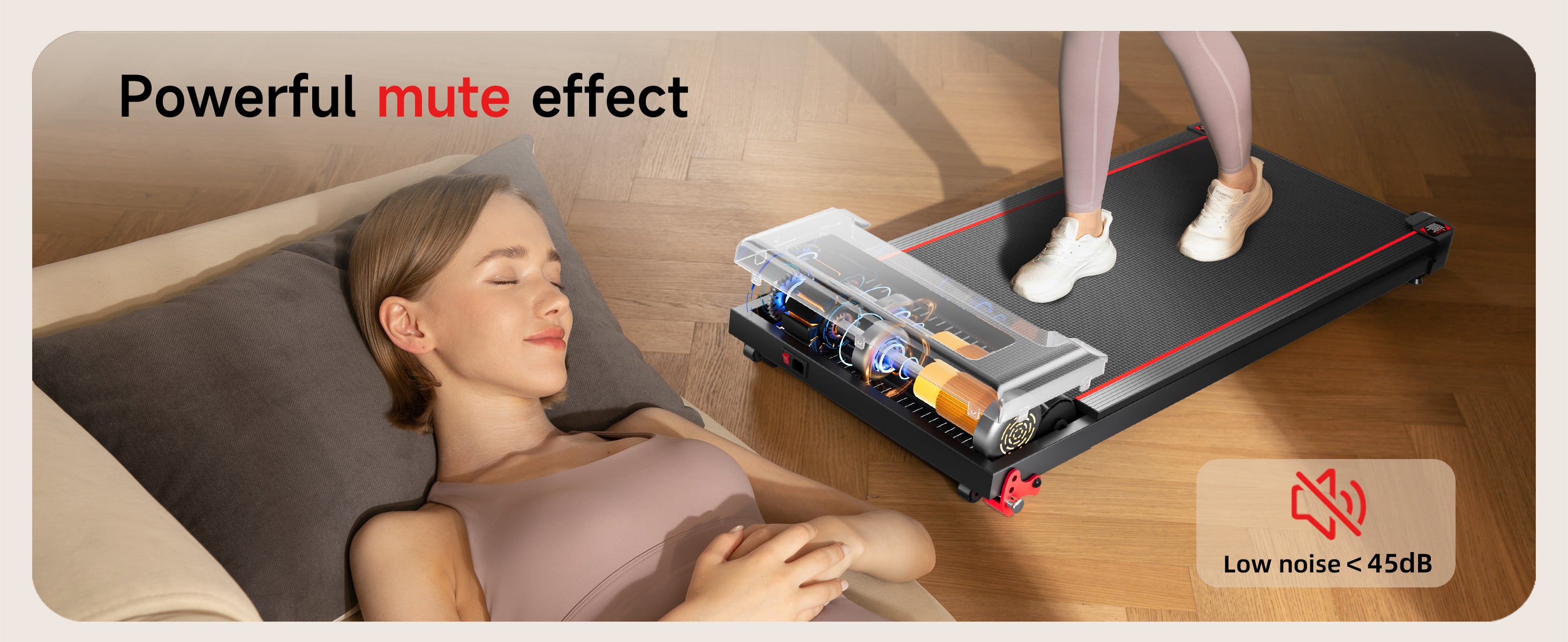 Powerful But Quiet Motor: The treadmill has a powerful 2.5HP motor with a weight capacity of 300 lbs; The powerful motor of this walking treadmill pad under desk not only has a stable and high weight capacity but also can be ultra-quiet! You can exercise anytime, anywhere at home or in the office without disturbing others when using this quiet walking pad.